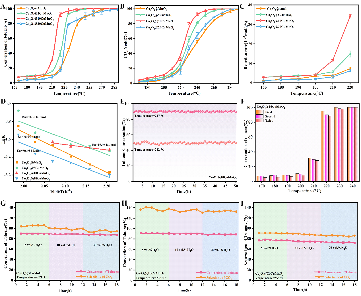 图 Cu修饰Co3O4@MnO2催化甲苯氧化的性能和稳定性